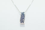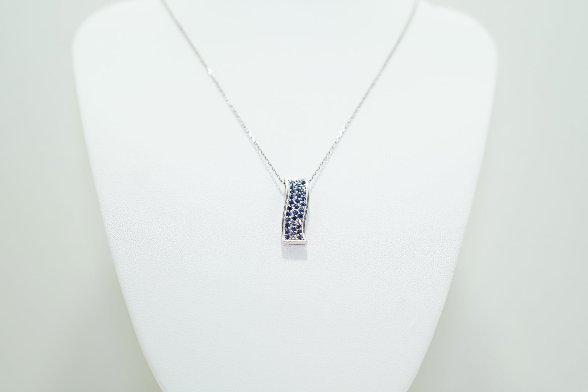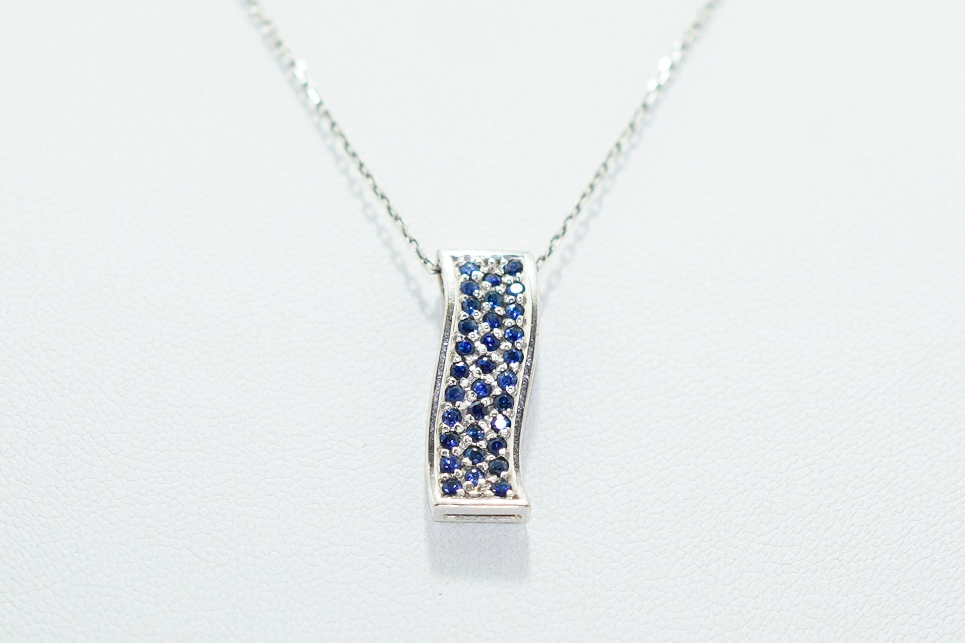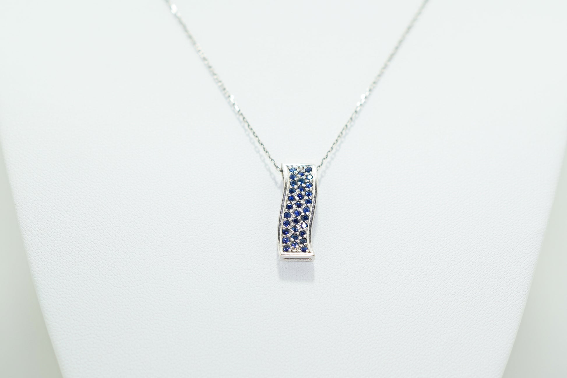 This elegant 18K white gold pendant features 32 stunning blue sapphires, totaling 1.6 carats in weight. A beautiful and sophisticated piece that adds a burst of color and luxury to any ensemble.