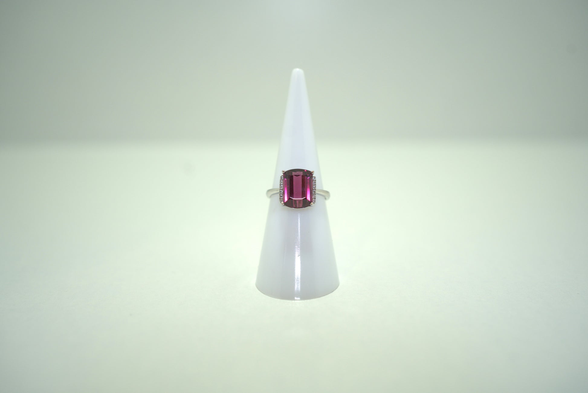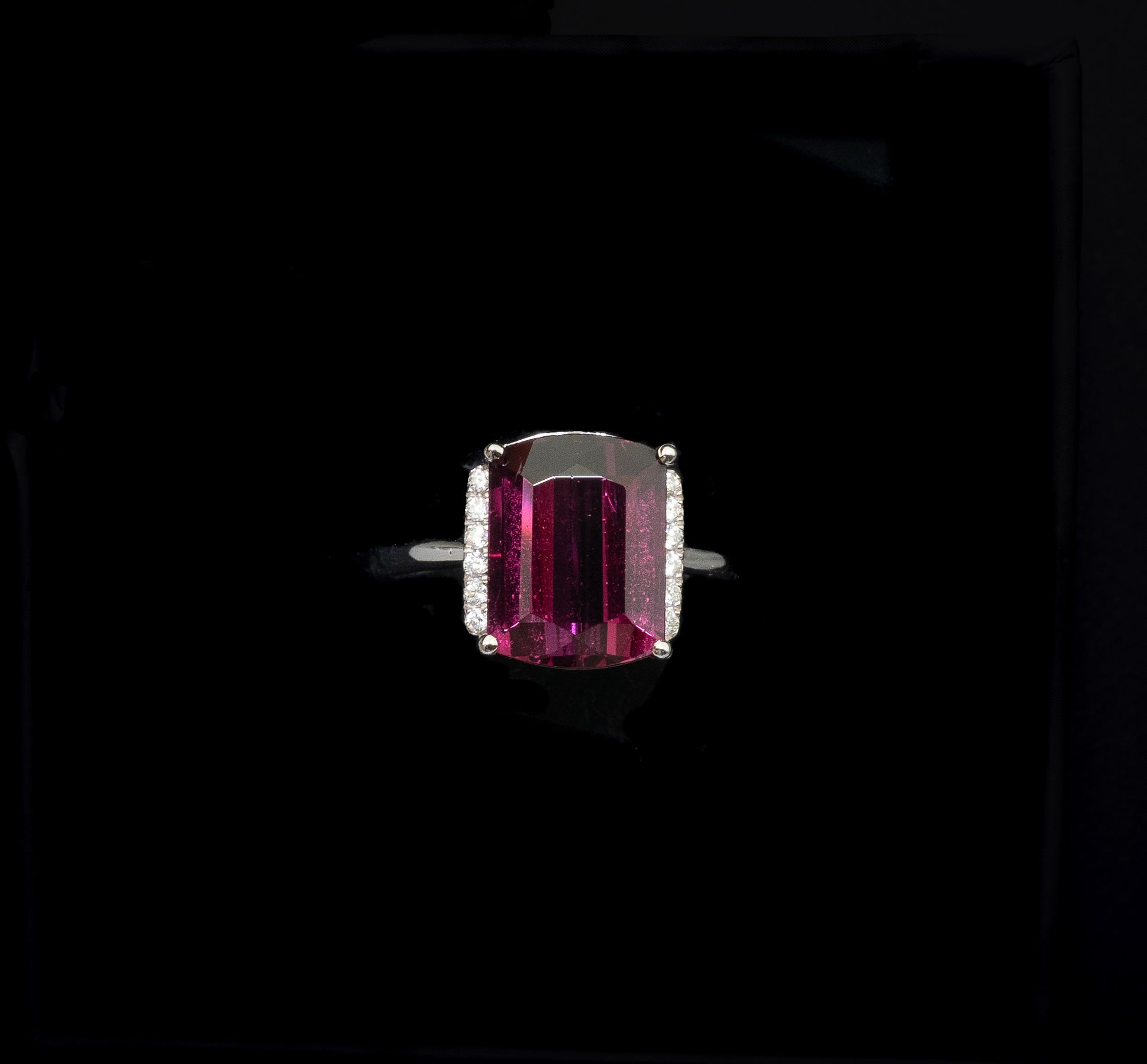 This elegant 18K white gold ring features a stunning 4.6-carat garnet, beautifully complemented by 12 dazzling diamonds. A perfect combination of vibrant color and sparkling brilliance, this ring exudes sophistication and luxury.