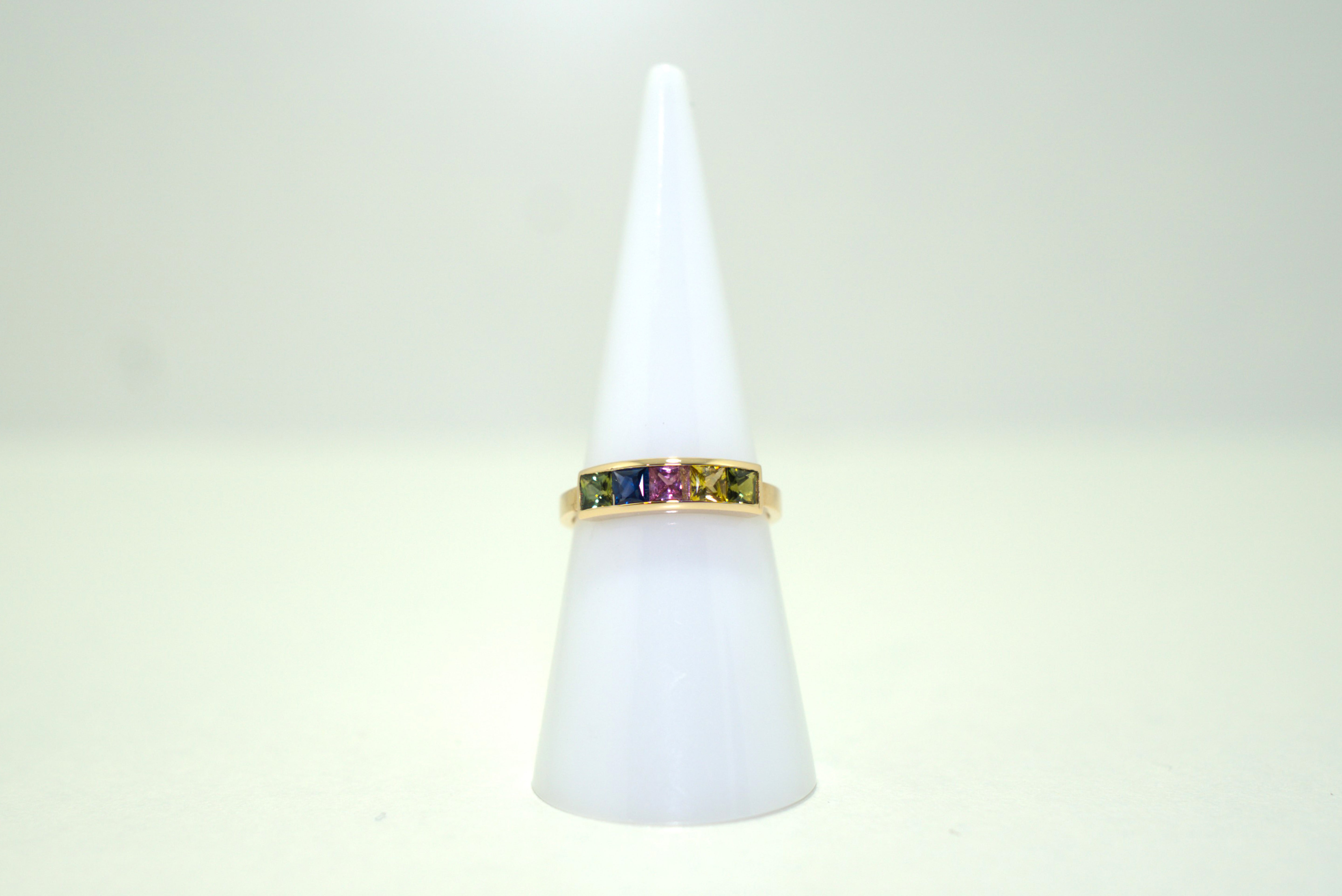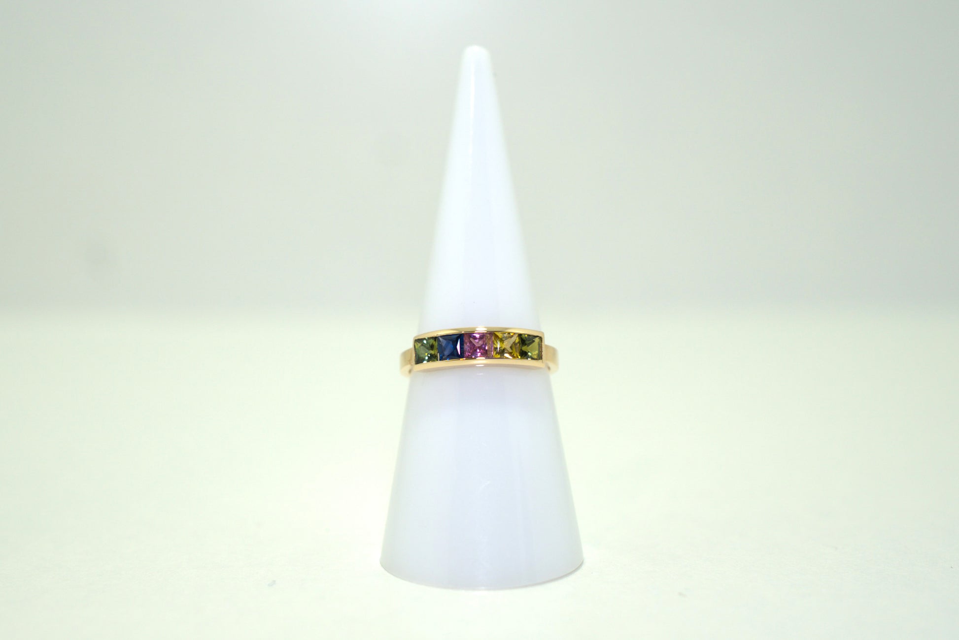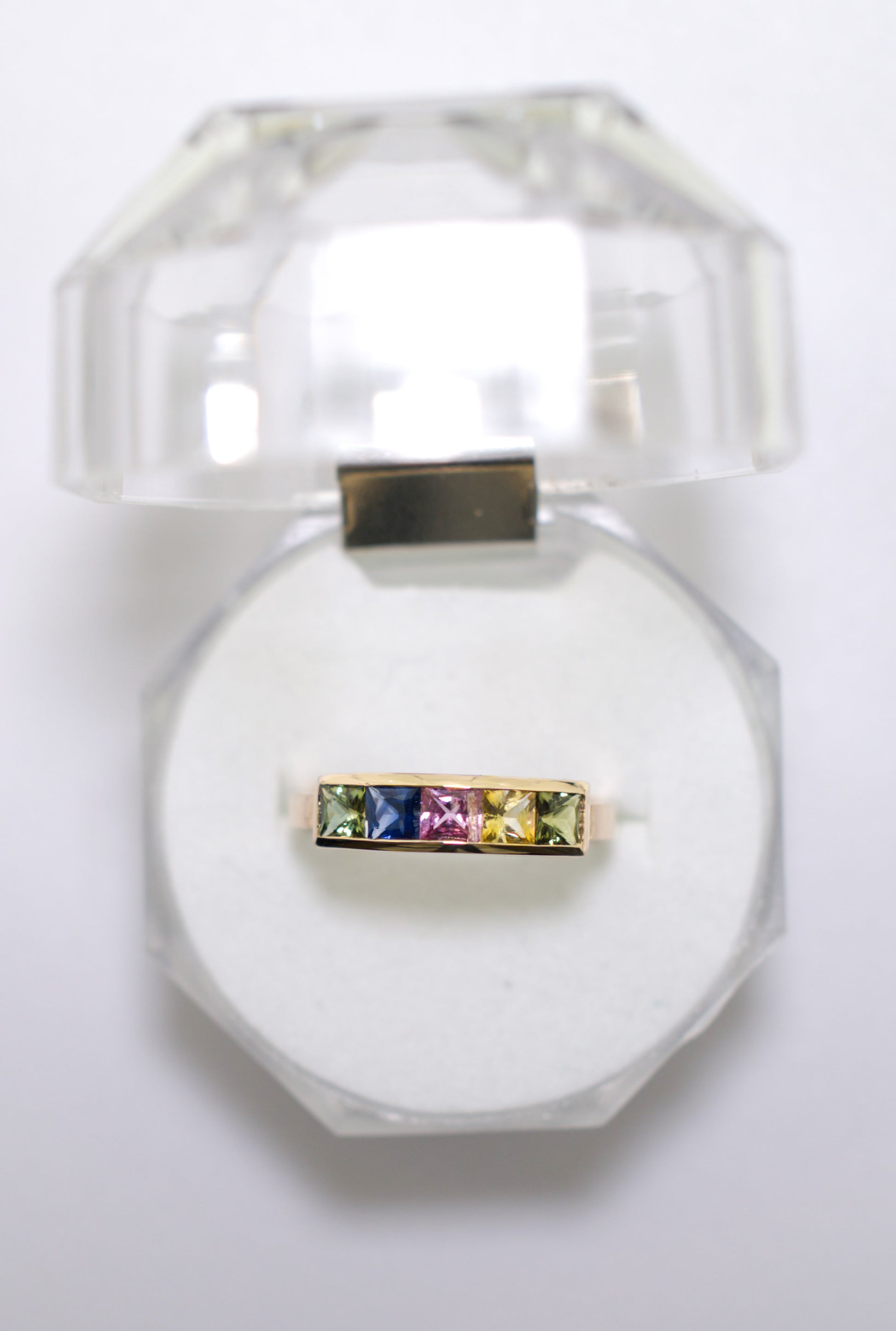 This Mix Sapphire ring, crafted from 14K yellow gold, features five stunning mixed sapphires totaling 2.45 carats. A luxurious and elegant piece, it adds a vibrant touch to any outfit, effortlessly elevating your style with its captivating beauty.
