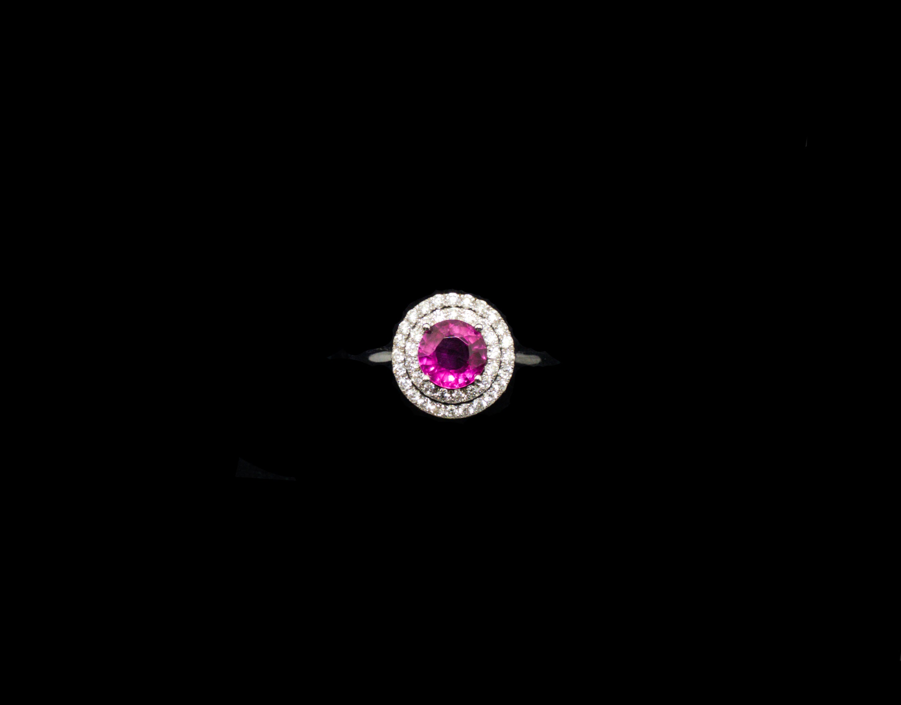 This elegant 18K white gold ring features a stunning 1.04-carat ruby, surrounded by 45 dazzling diamonds arranged in multiple rows. A luxurious combination of vibrant color and sparkling brilliance, this ring exudes sophistication and timeless beauty.