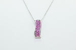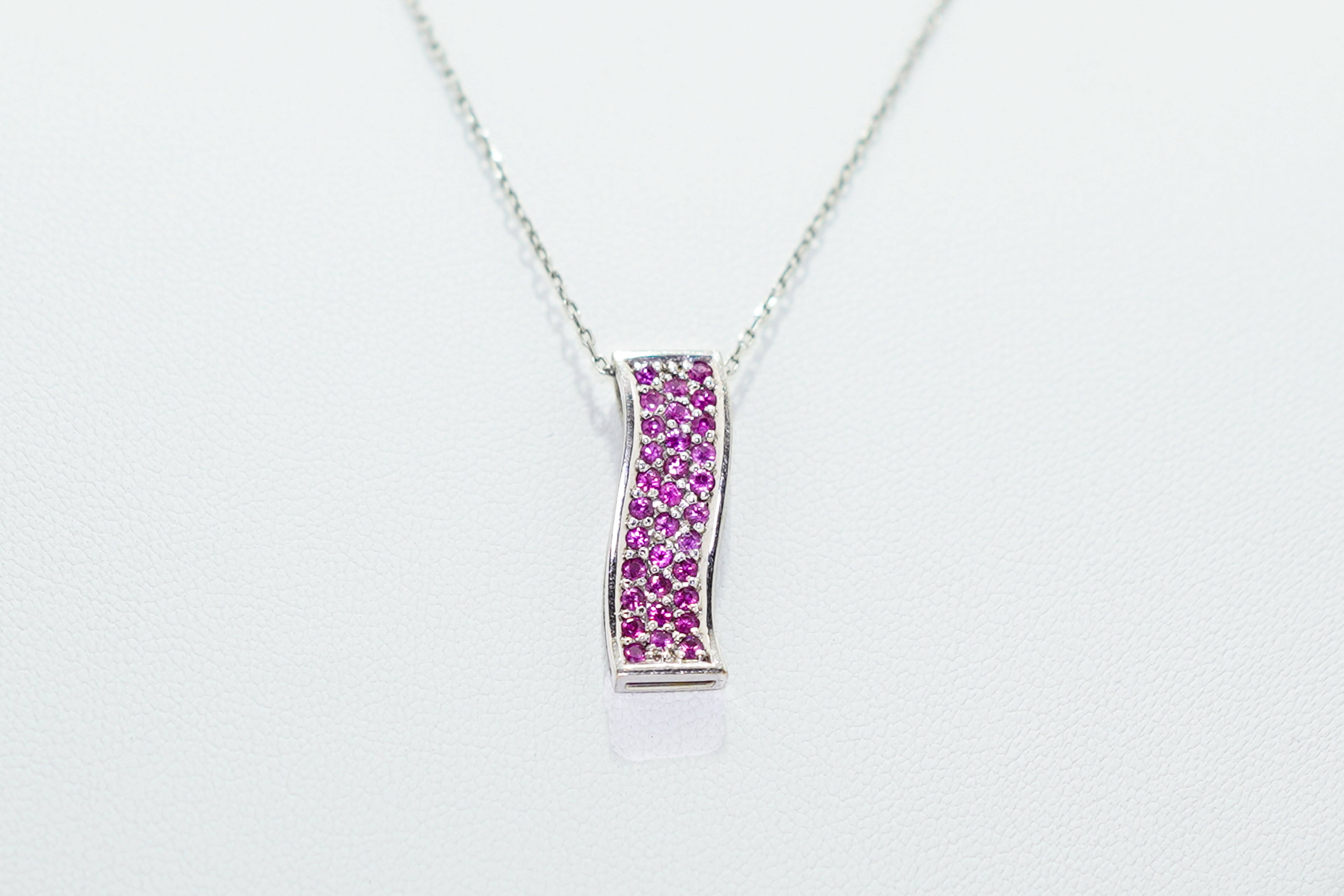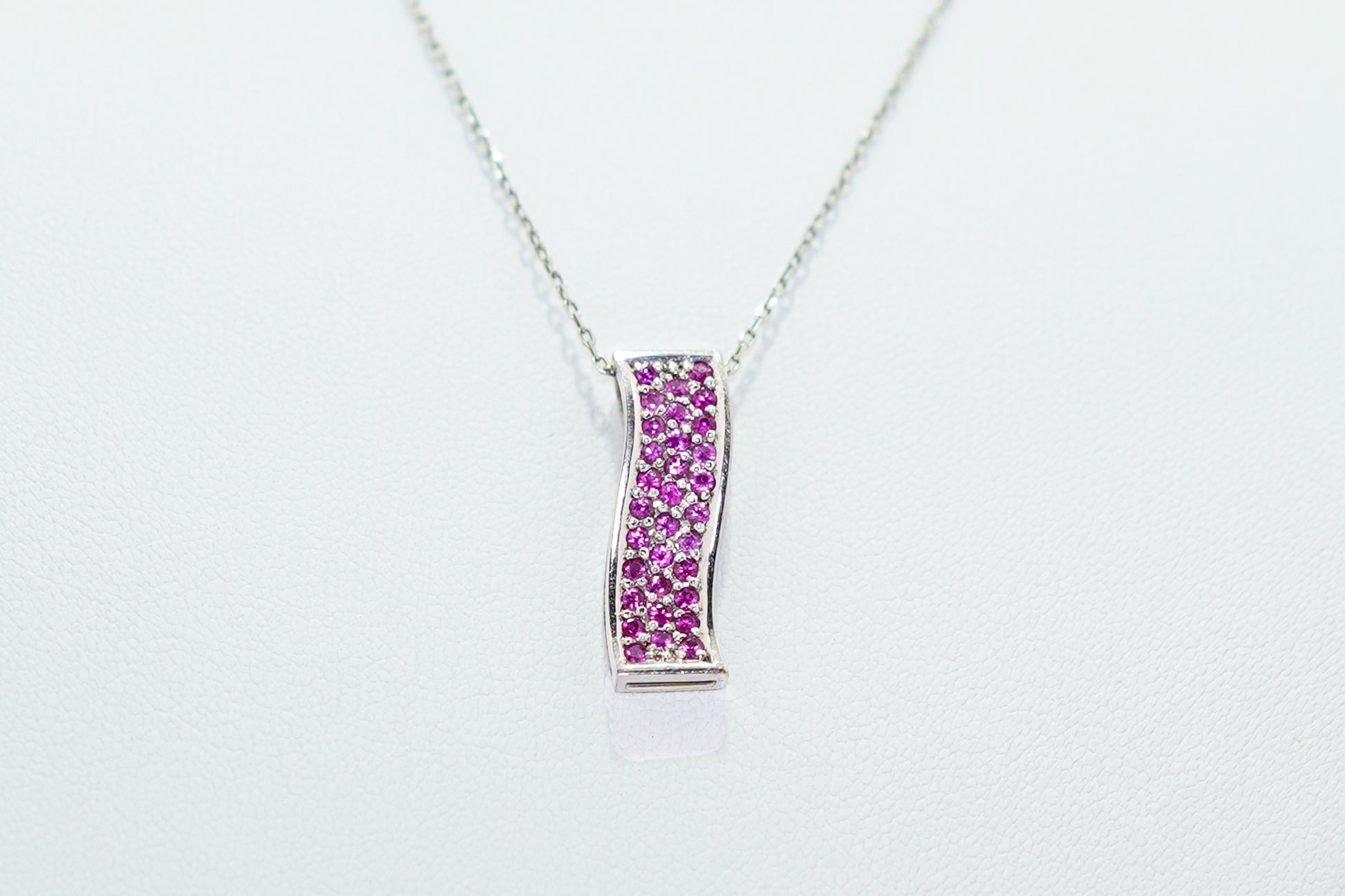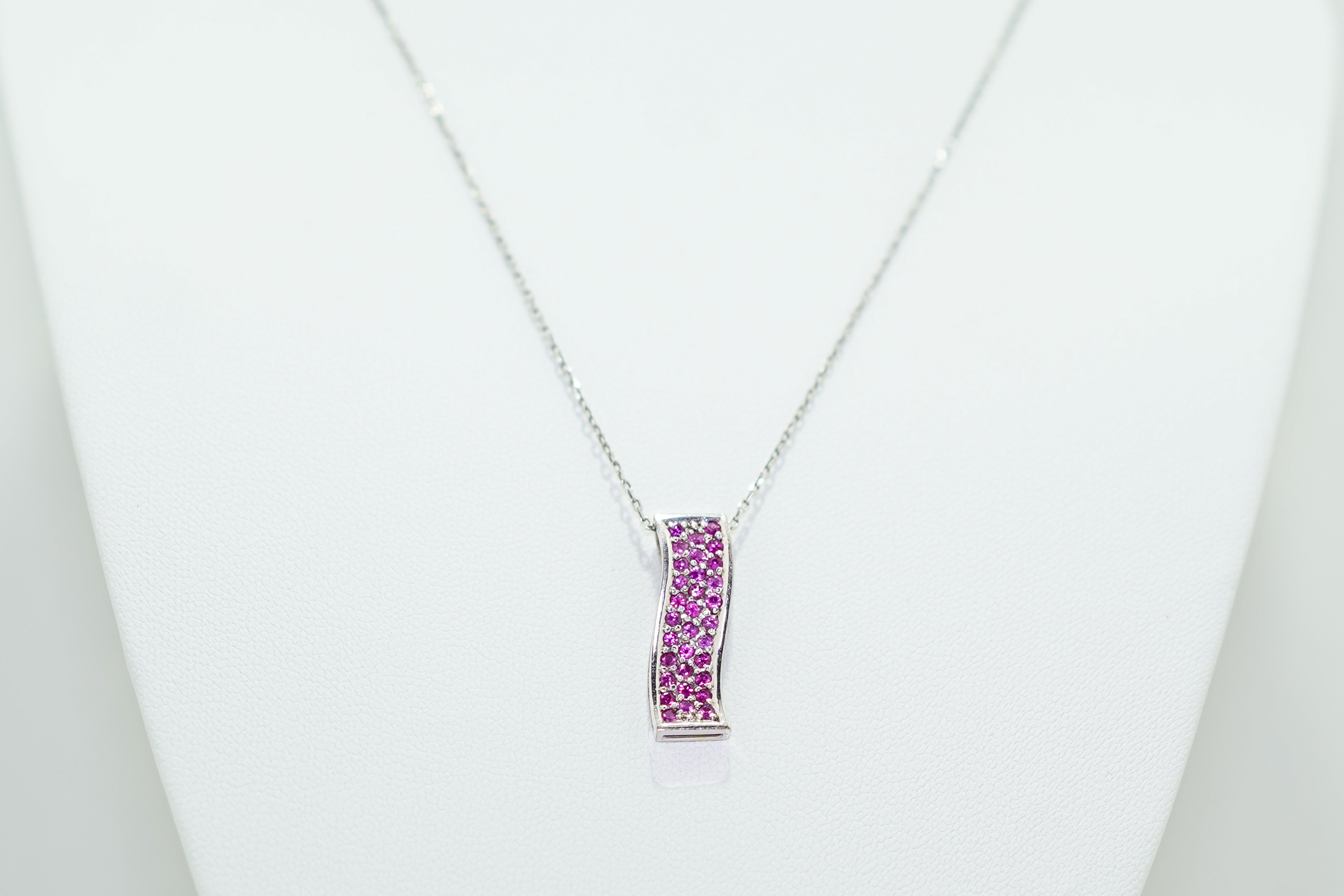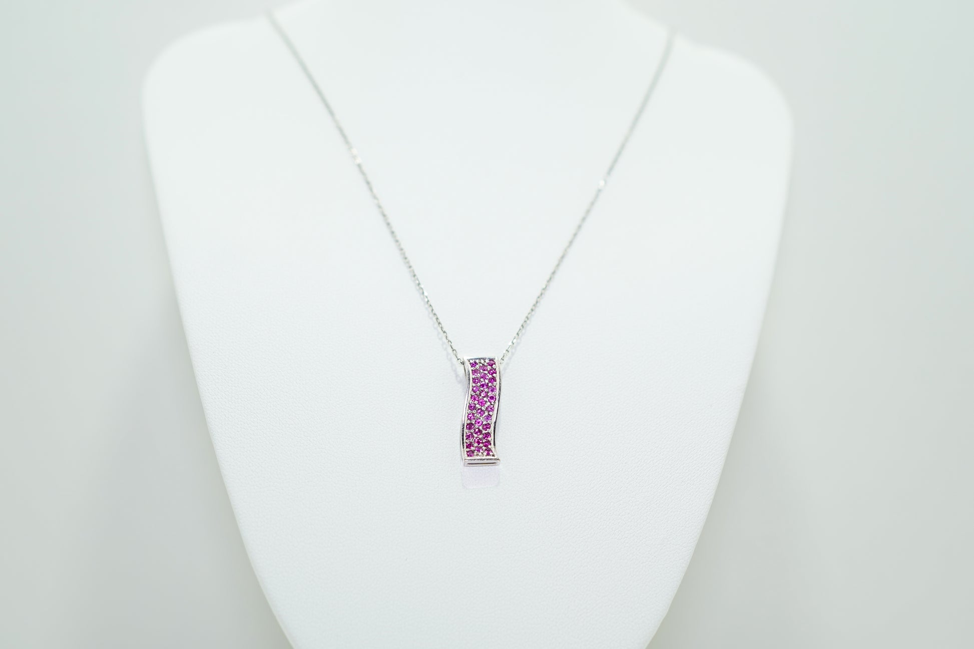 This elegant 18K white gold pendant features 32 stunning pink sapphires, with a total weight of 1.6 carats. A graceful and vibrant piece, perfect for adding a touch of luxury and sophistication to any ensemble.