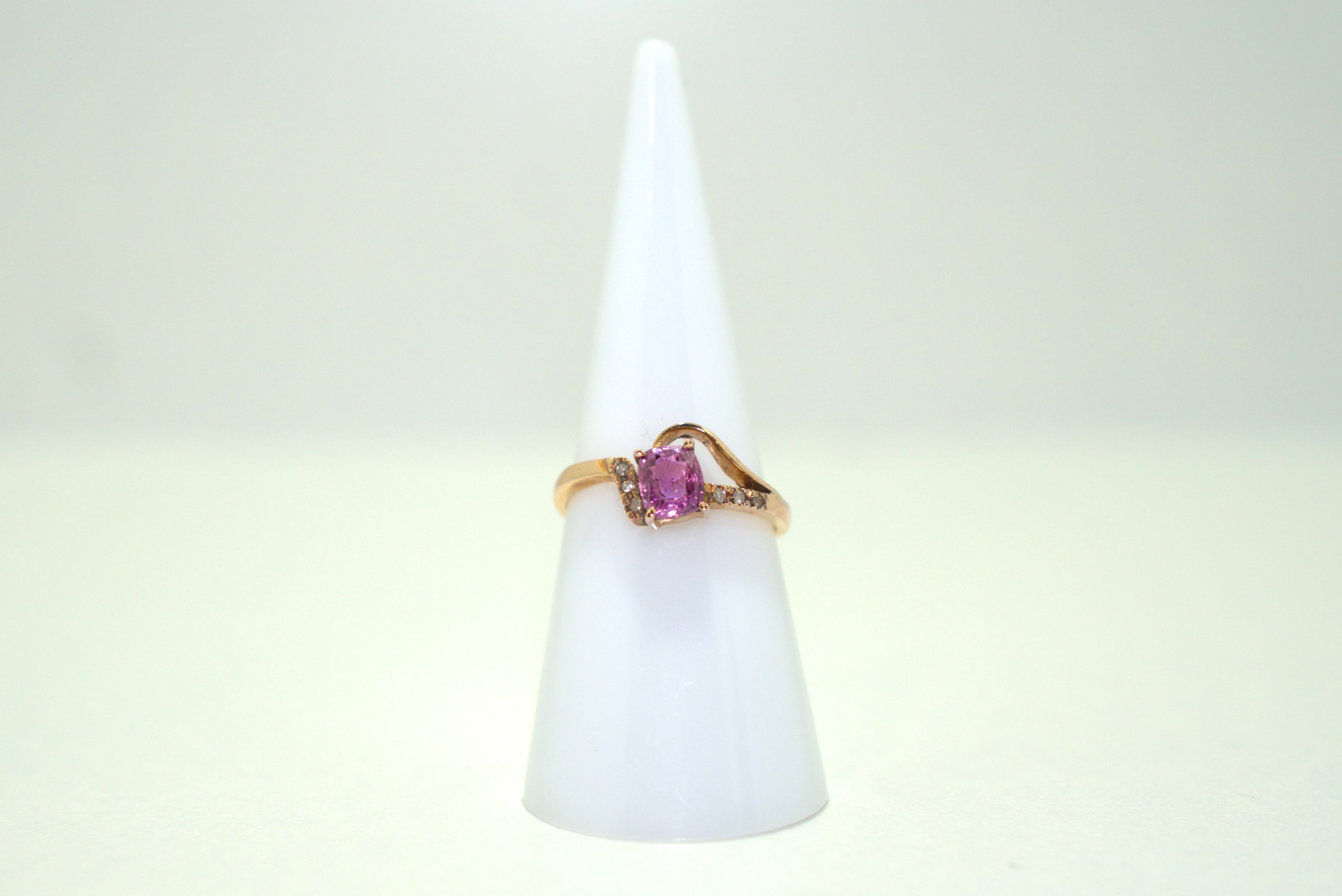 This 14K yellow gold ring features a beautiful 0.4-carat pink sapphire as the center stone, complemented by 6 sparkling diamonds. Weighing a total of 2.25 grams, this stunning and timeless piece adds a touch of elegance and sophistication to any outfit. A perfect blend of color and luxury.