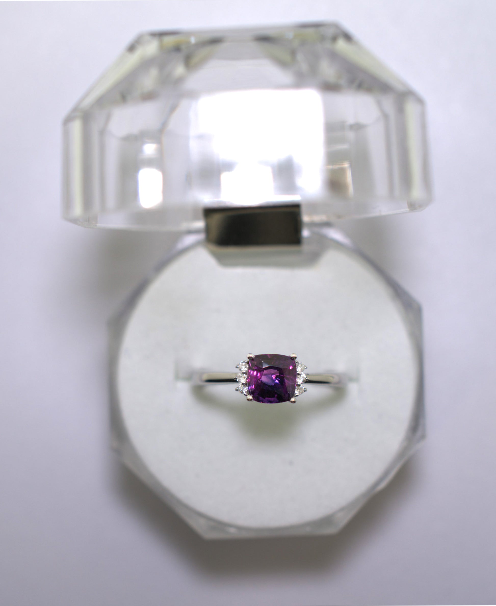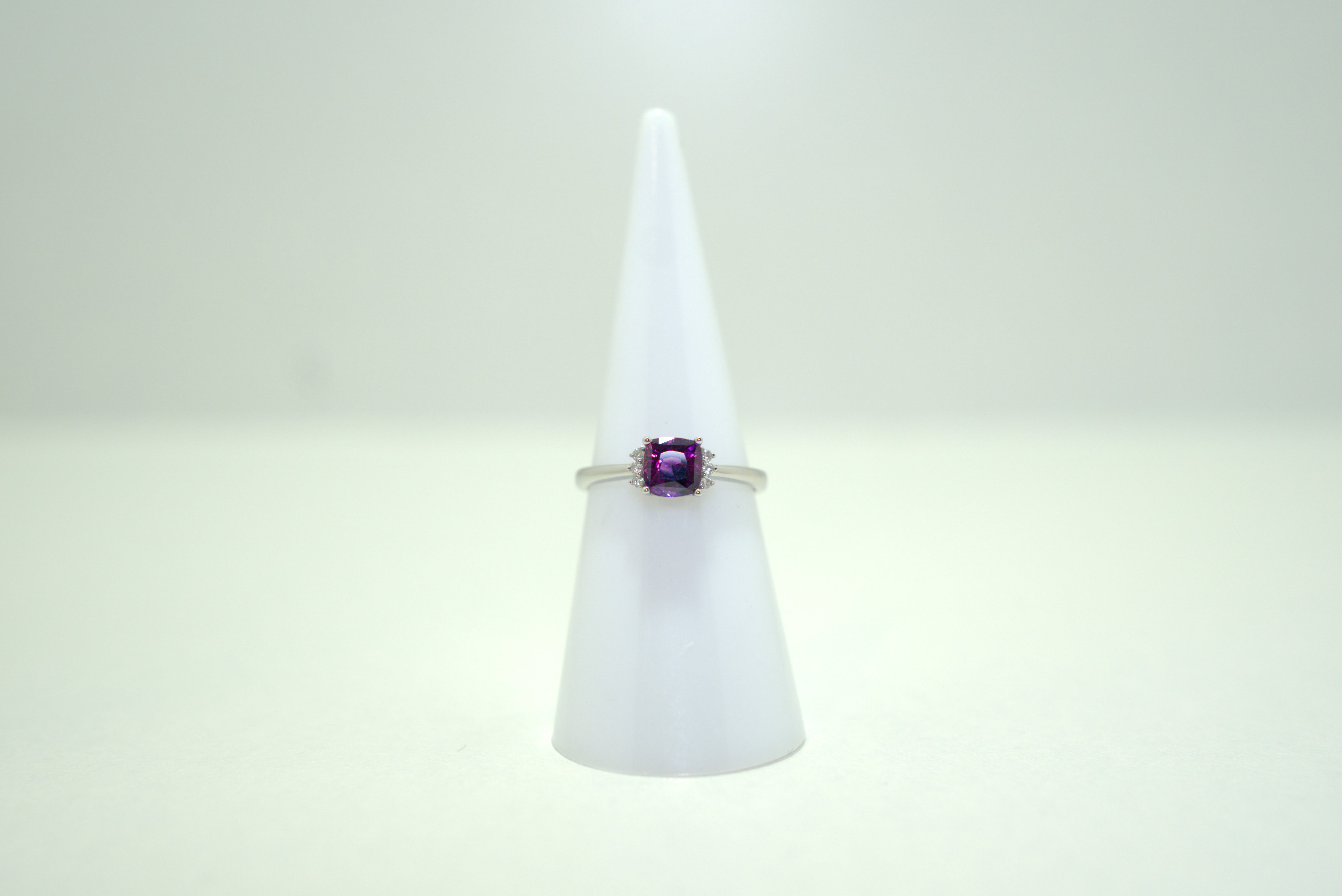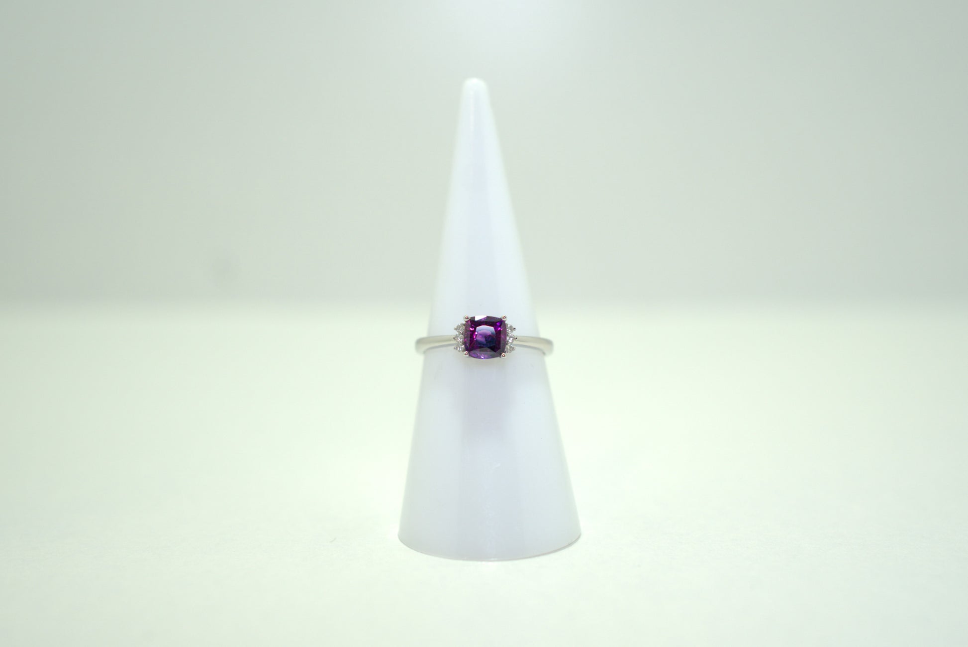 This elegant 18K white gold ring features a stunning 1.6-carat purple sapphire, complemented by 6 sparkling diamonds. A beautiful combination of vibrant color and brilliance, this ring exudes luxury and sophistication, making it a perfect addition to any collection.