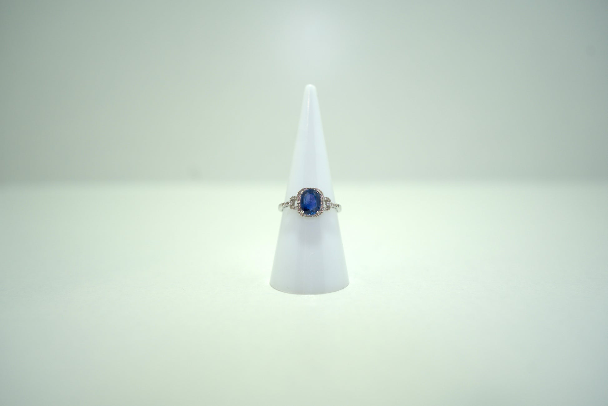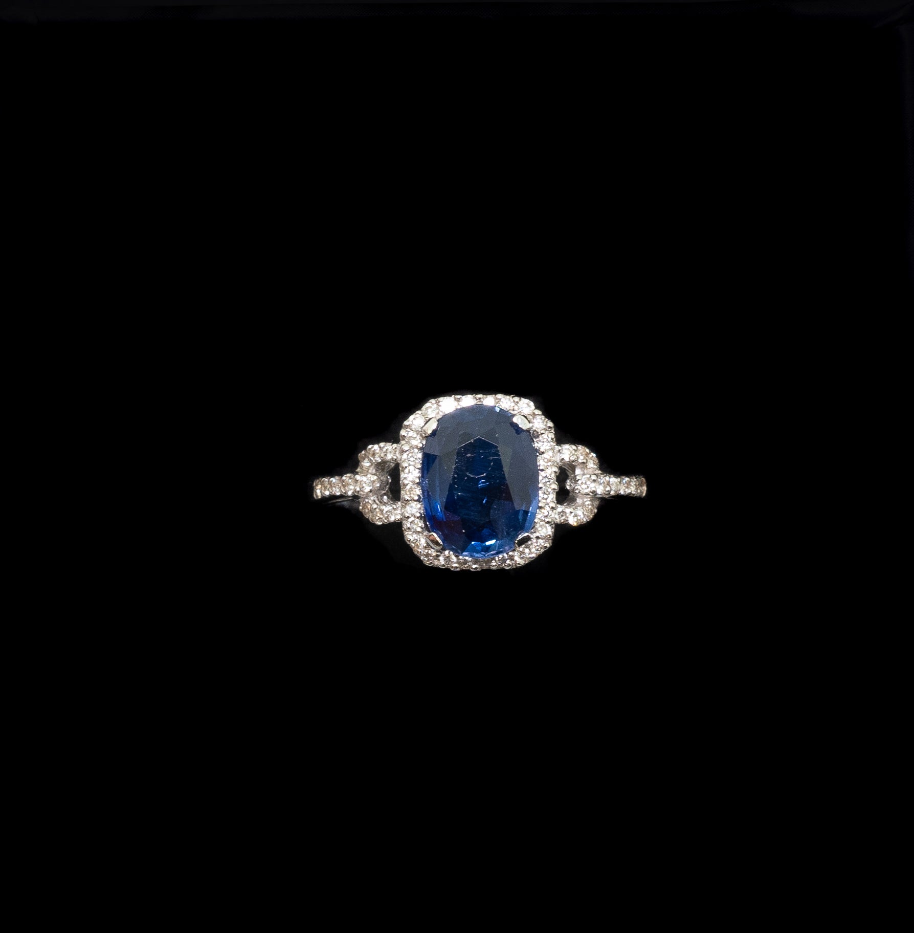 This elegant 18K white gold ring features a stunning 3.6-carat blue sapphire, surrounded by 46 dazzling diamonds. A perfect blend of vibrant color and brilliant sparkle, this ring exudes luxury, sophistication, and timeless beauty.