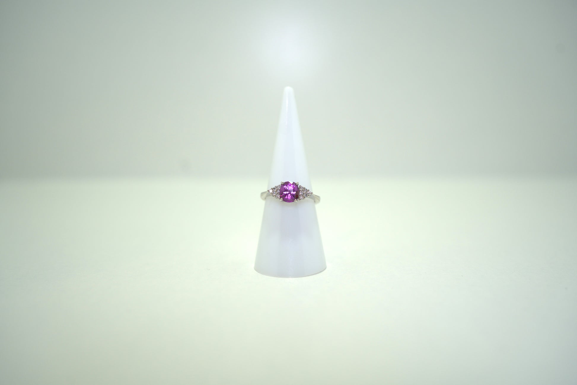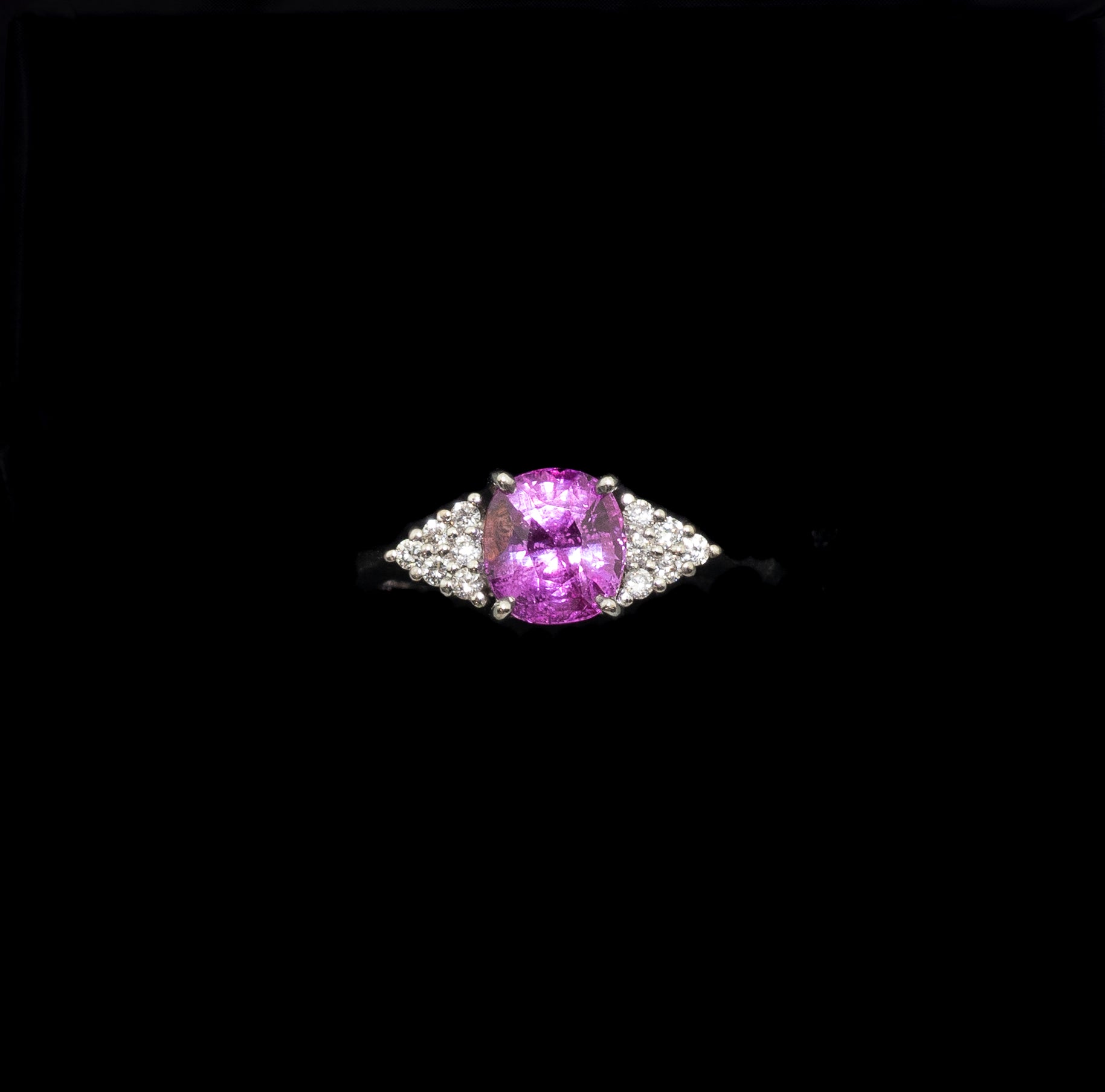 Upgrade your jewelry collection with our Purplish Pink Sapphire & Diamond Ring. Expertly crafted from 18K White Gold, this exquisite piece features a stunning 2.05-carat purplish pink sapphire, complemented by 12 dazzling diamonds. A perfect fusion of elegance and luxury, it’s a timeless addition to any refined collection.
