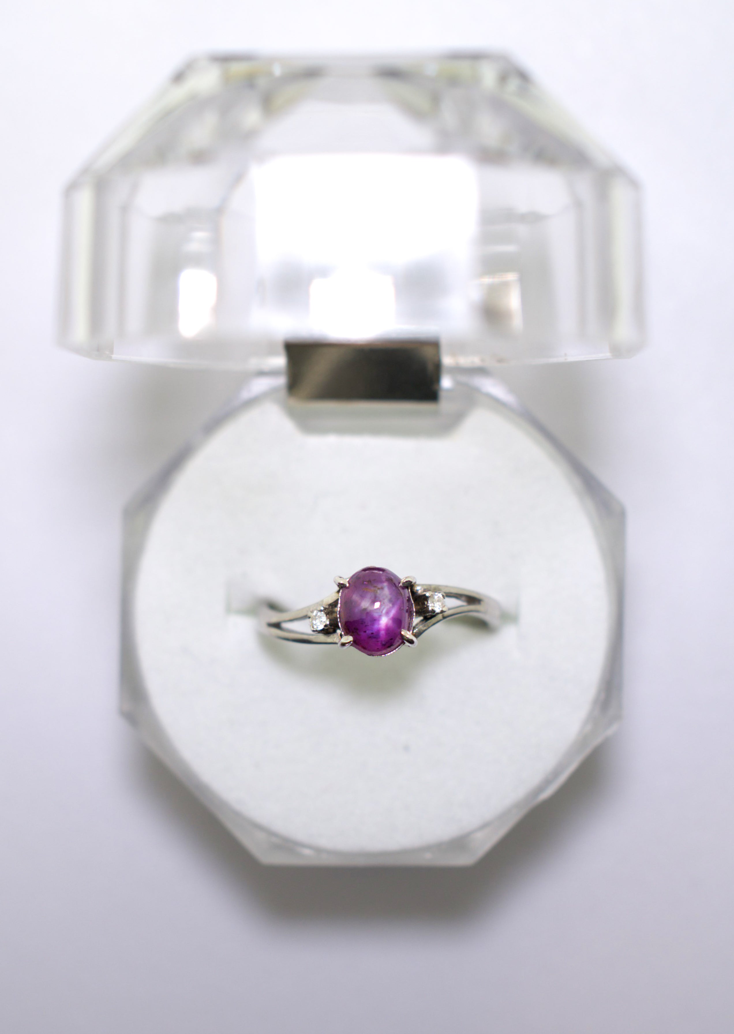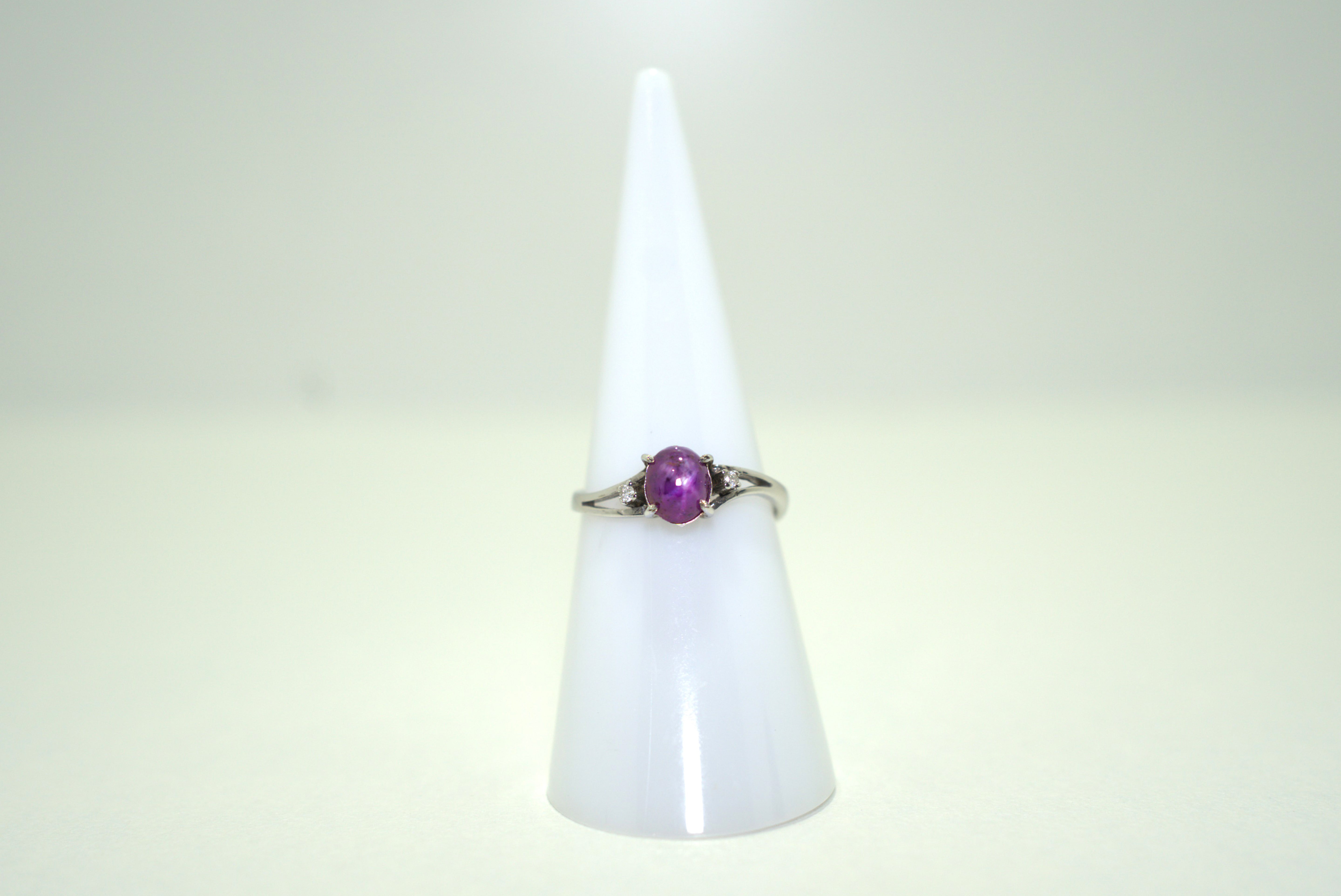 This elegant 14K white gold ring features a stunning 0.4-carat star ruby, beautifully complemented by 2 sparkling diamonds. A unique and sophisticated design that highlights the captivating star effect of the ruby, adding a touch of elegance and charm to any ensemble.