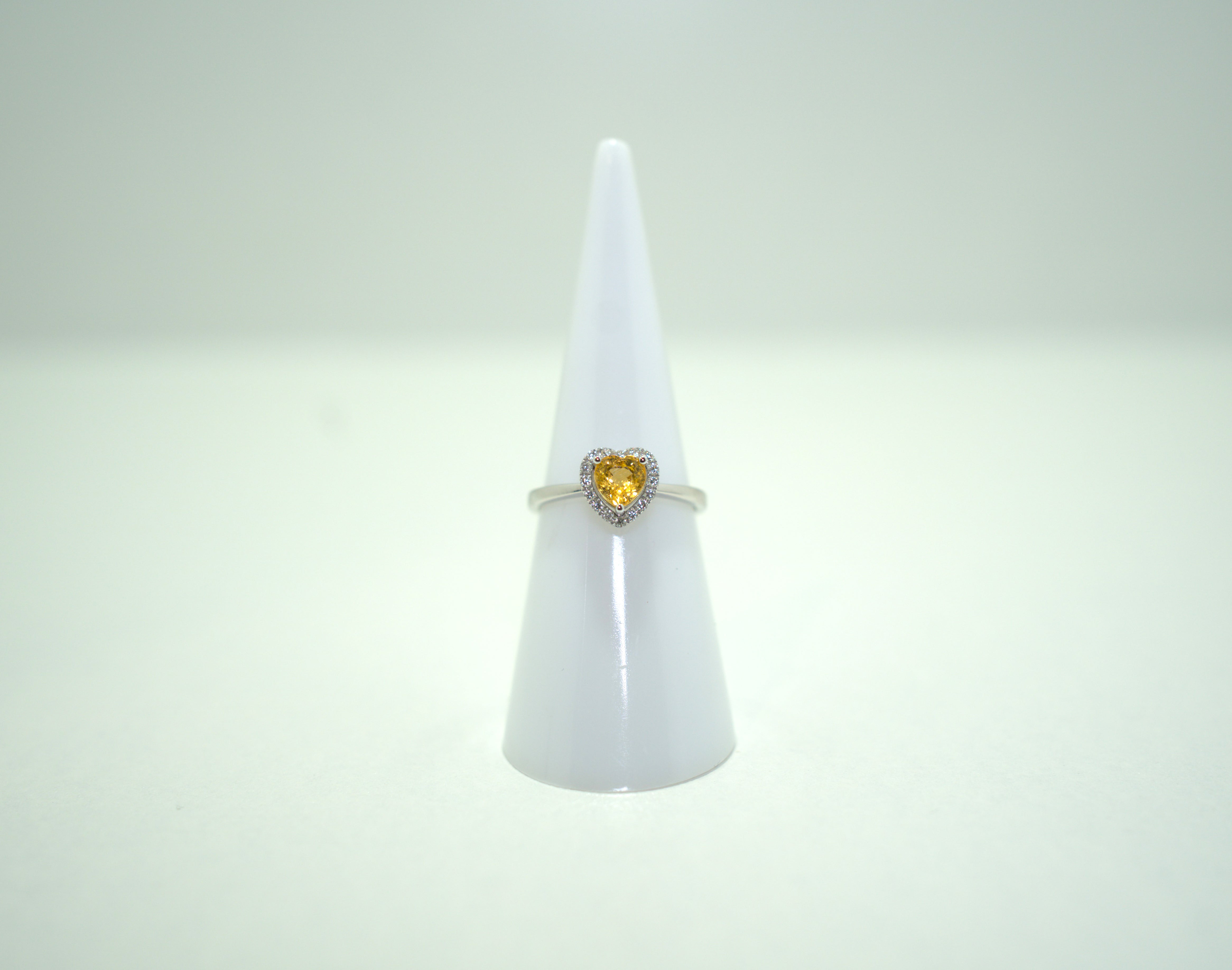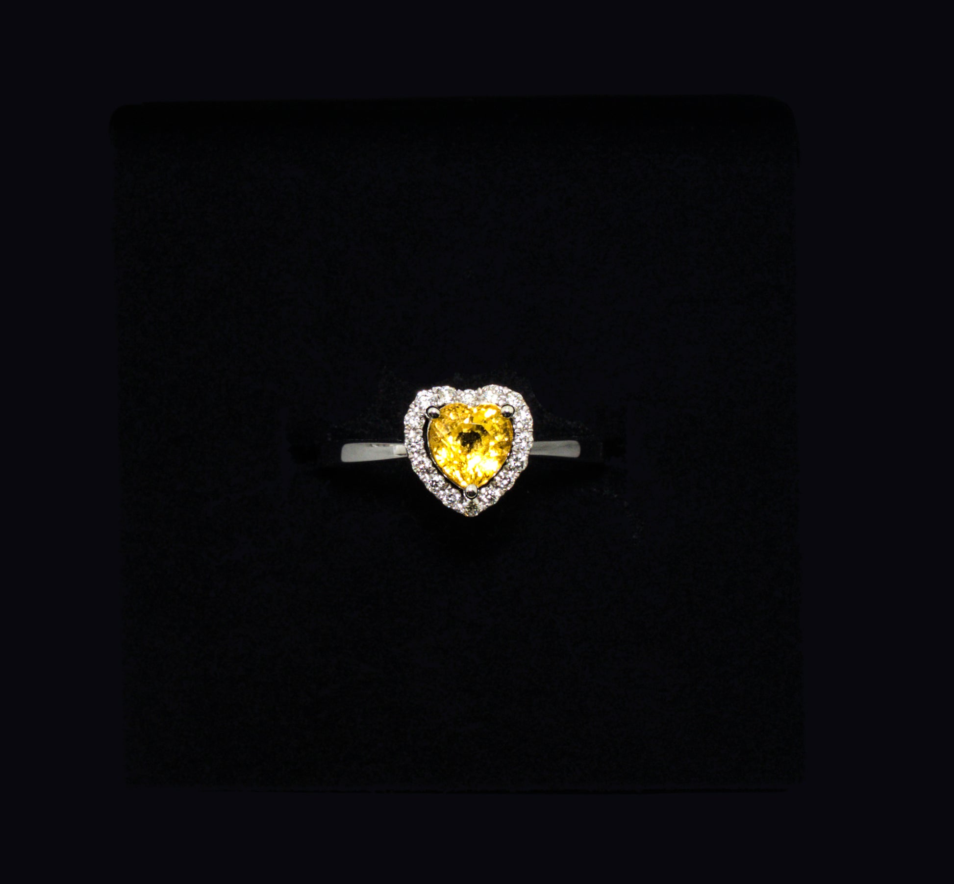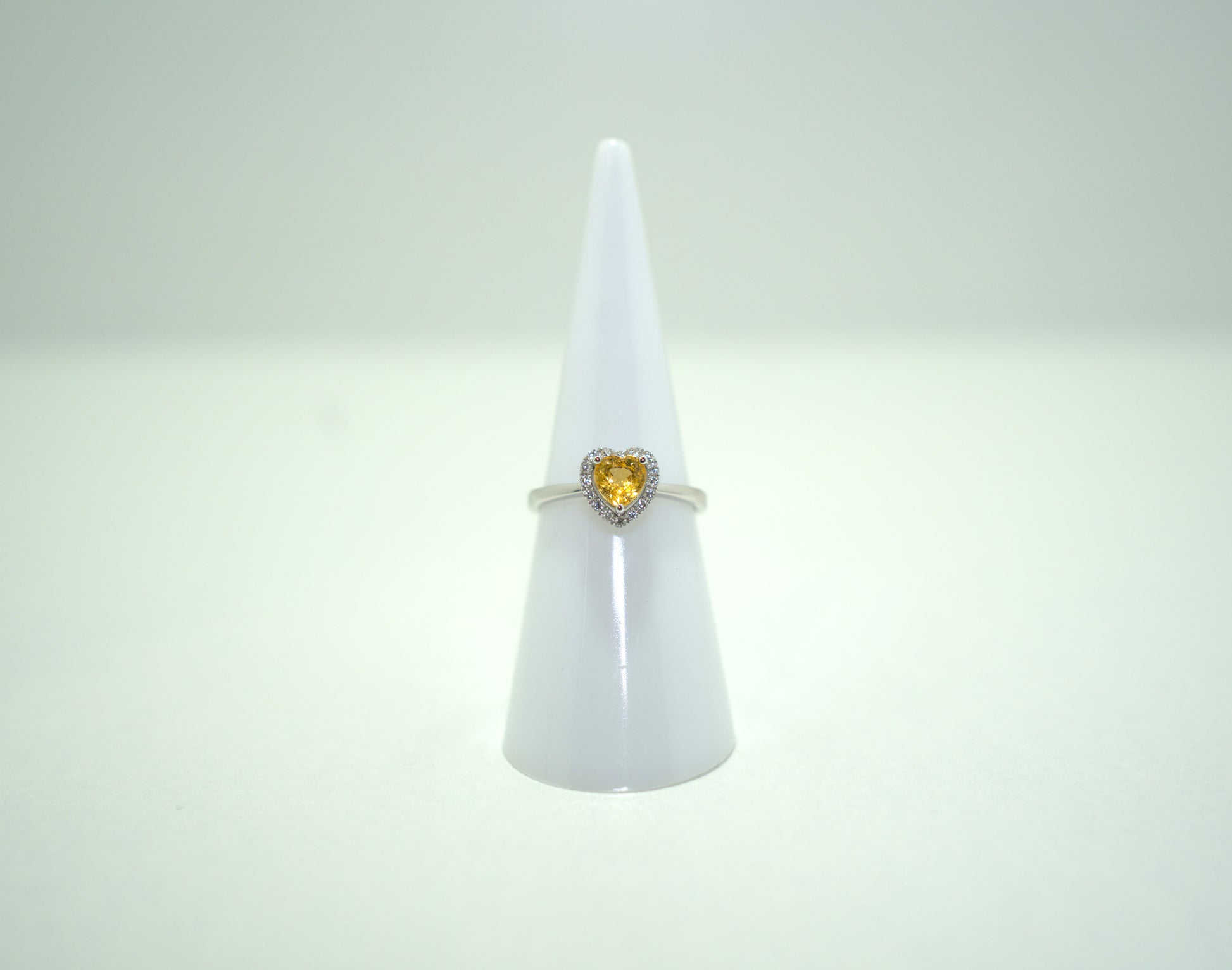 This elegant 18K white gold ring features a stunning 0.8-carat yellow sapphire, beautifully complemented by 16 dazzling diamonds. A perfect combination of vibrant color and sparkling brilliance, this ring adds a touch of sophistication and luxury to any ensemble.